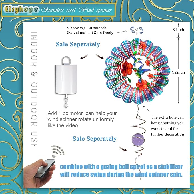 - 【 Premium Kinetic Wind Spinners 】Our high quality wind spinner is artistic and durable. Made of stainless steel material, laser cut, hand polished and painted with epoxy protection, this stainless steel wind spinner is one of the best metal wind spinners, highly weather resistant, rust resistant and reflective. This quality outdoor décor has incredible color and light reflections that add color, movement and beauty to indoor and outdoor spaces.