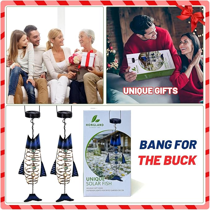 - 【Unique Solar Fish Design】- 2 Package offers excellent value for money. This garden art decor features handcrafted ironwork, including processes such as pattern making, rolling, lifting, blanking, forging, riveting, assembling, polishing, cladding, spraying, painting, stringing, packaging, and final delivery to the customer. The exceptional craftsmanship imbues the metal fish with unique character and adds beautiful string lights for added charm