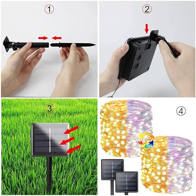 - 【New Upgraded Solar String Lights Outdoor】: Super Bright 2-Pack Total 80ft 200 LEDs Warm White ⇋ Multicolor String Lights with Upgraded LED Bulbs, Higher Conversion with Larger Size Solar Panel, Larger Capacity Battery(1800mAh ), IP65 Waterproof Performance.