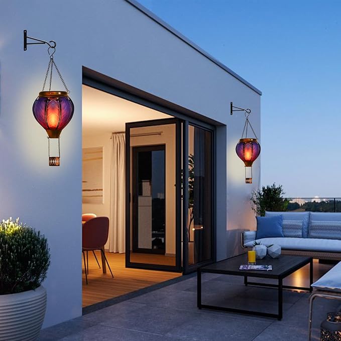 - 【Hot Air Balloon Design】This blue pink balloons solar lantern is made of thick glass and a realistic flame lights. When the sun goes down, the flickering flame effect resembles a real hot air balloon, creating an amazing visual effect and adding a great atmosphere to your garden, patio and yard.