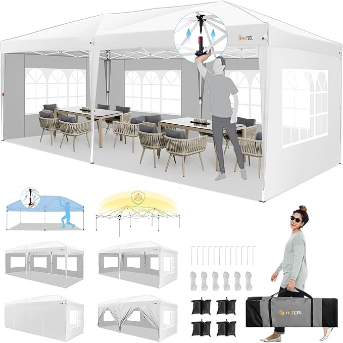 HOTEEL 10x20 Pop up Canopy with Sidewalls, One Push Outdoor Tents for Parties Waterproof Canopy Tent with Reinforce Rod, Easy Setup Event Tent with Sandbag for Backyard, Camping, Wedding, White