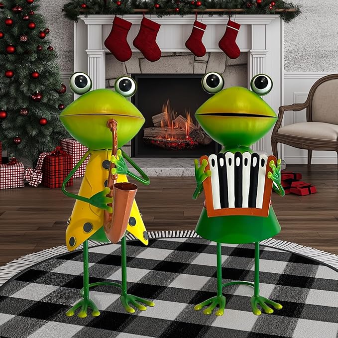 - 【Frog Garden Decor】Featuring frogs music garden decor for outside wearing gorgeous costume, one plays saxophone and the other plays accordion. Add bright colors to your favorite indoor&outdoor potted plants, create a whimsical vibe to your patio or front yard