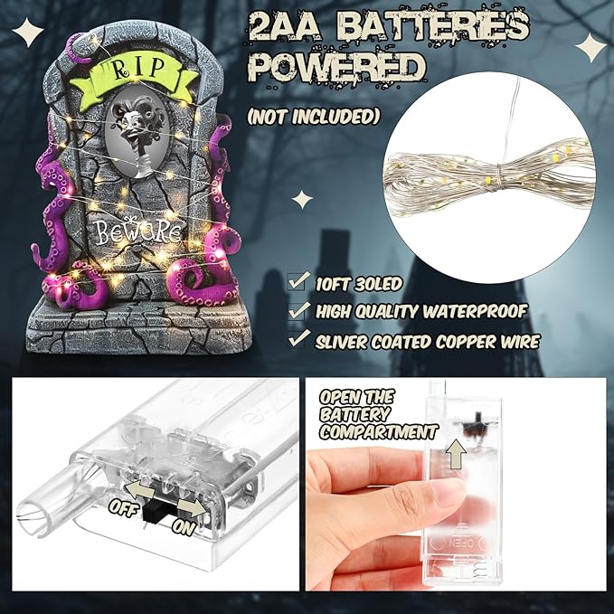 - Nighttime Availability: our Halloween decorations outdoor graveyards come with 6 pack 3-meter long warm white led copper wire light strings (batteries not included), each with 30 LED lights; The exterior is waterproof, and the copper wire inside has good conductivity, which can be shaped and easily wrapped around the tombstone