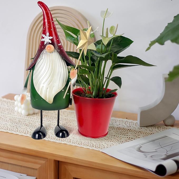 - Gnome Decor: This charming metal gnome figurine with its vibrant red hat adorned with snowflakes and hold a golden star adds a whimsical touch to your home and garden decorations