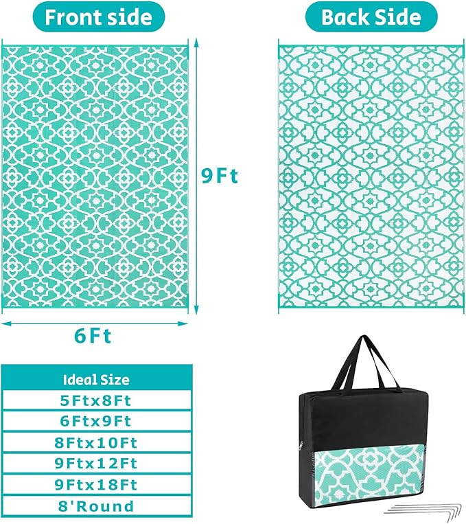 • XL Large Reversible Outdoor Rugs: Featuring a classic moroccan pattern on both sides, this rectangular 6x9 ft outdoor area rug allows you to instantly refresh your patio, porch, backyard, deck, RV campsite. And this outdoor deck rug is reversible, two-sided design allows you to have two different looks,both sides can blend perfectly with nature and look very full and comfortable.