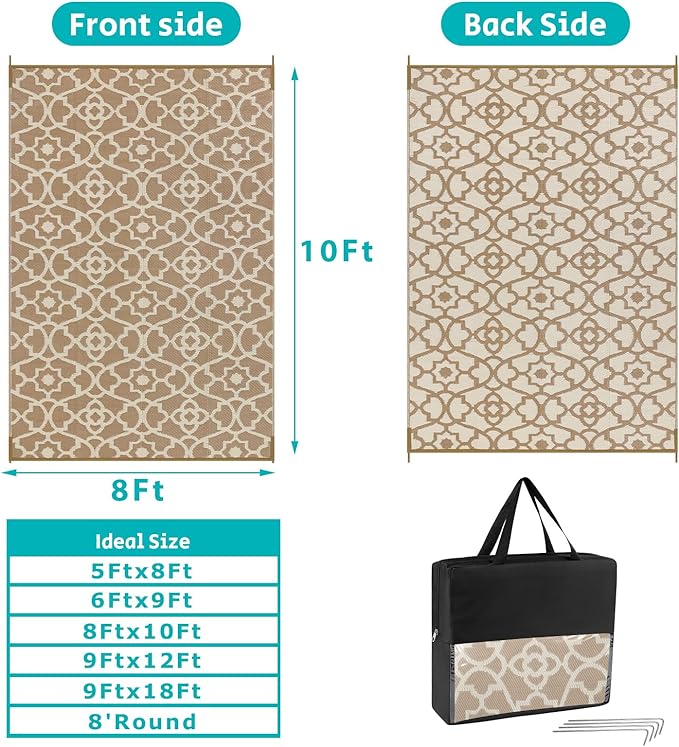 - XXL Large Reversible Outdoor Rugs: Featuring a classic moroccan pattern on both sides, this rectangular 8x10 ft outdoor area rug allows you to instantly refresh your patio, porch, backyard, deck, RV campsite. And this outdoor deck rug is reversible, two-sided design allows you to have two different looks,both sides can blend perfectly with nature and look very full and comfortable.