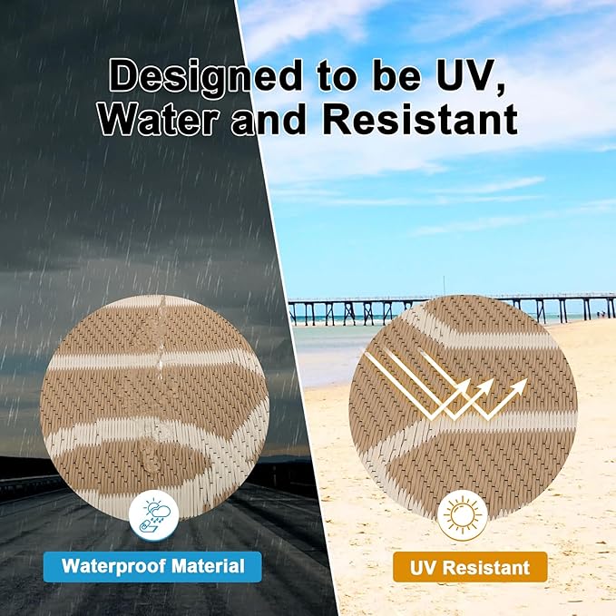 • Premium Material Outdoor Doormat: This reversible outdoor doormats are made from high quality recycled plastic straws and be woven tightly, durable enough, no fade, water resistant. It's soft and comfortable to walk on barefoot.Plus, the high-end UV coating and edge heat treatment technology prevent fading and sun damage without worrying about wear and tear.