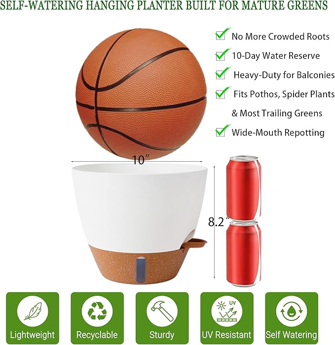 - Note: This large hanging planter features a 10-inch wide opening (comparable to a basketball's diameter) and stands 8.26" tall (about the height of two standard soda cans). Designed specifically for mature plants like spider plants and pothos, it is not recommended for small succulents or tight spaces. Always measure your current pots or intended placement area before purchase to ensure the dimensions meet your needs.