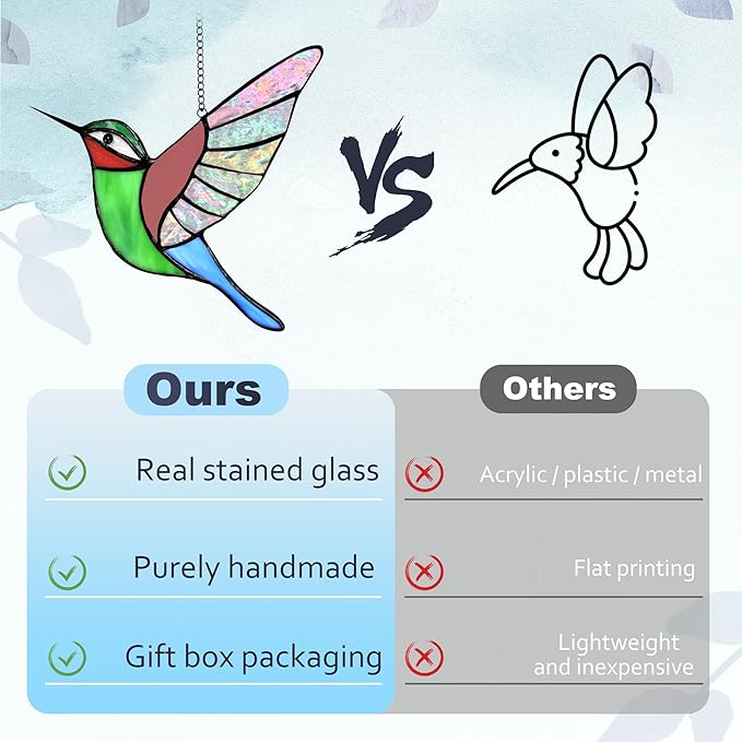 - Safety Protection:The hummingbird stained glass window hanging is packaged independently,placed inside a box,and covered with soft foam to ensure a safe delivery to your hands!If you have any questions about our product,please feel free to contact us at any time
