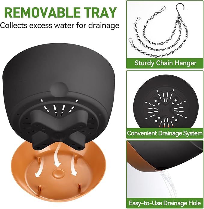 - 【Watering Made Easy】 Our hanging plant pots feature a built-in drainage system and a water reservoir tray that stores enough water for 7-14 days, preventing root rot and ensuring proper hydration. Ideal for busy schedules or travel, offering hassle-free plant care.
