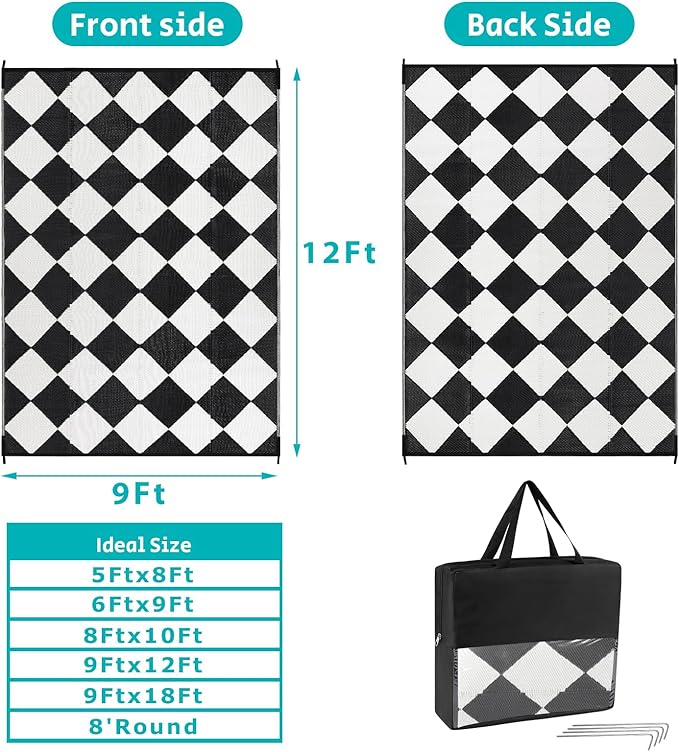 • Versatile Outdoor Carpet: The indoor outdoor plastic rugs have multiple choice in different colors(4'x6',5'x8',6'x9',8'x10',9'x12',9'x18',8'round), is ideal for a variety of indoor outdoor activities,like patio mat, deck rug, garden rug, beach mat, picnic mat, BBQ party mat, rv camping rug,pool rug,outdoor doormat,garage rug,front door mat,allowing you to have plenty of imaginable space for more fun.