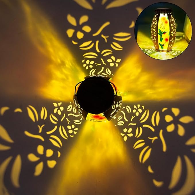 - 【Hummingbird Art Lantern】Solar lanterns outdoor waterproof adopts an artistic design combining colored glass and hollow metal, integrating hummingbird and flower element, paired with a retro copper appearance. At night, solar lantern projects a unique and charming pattern, adding an artistic atmosphere to your yard.